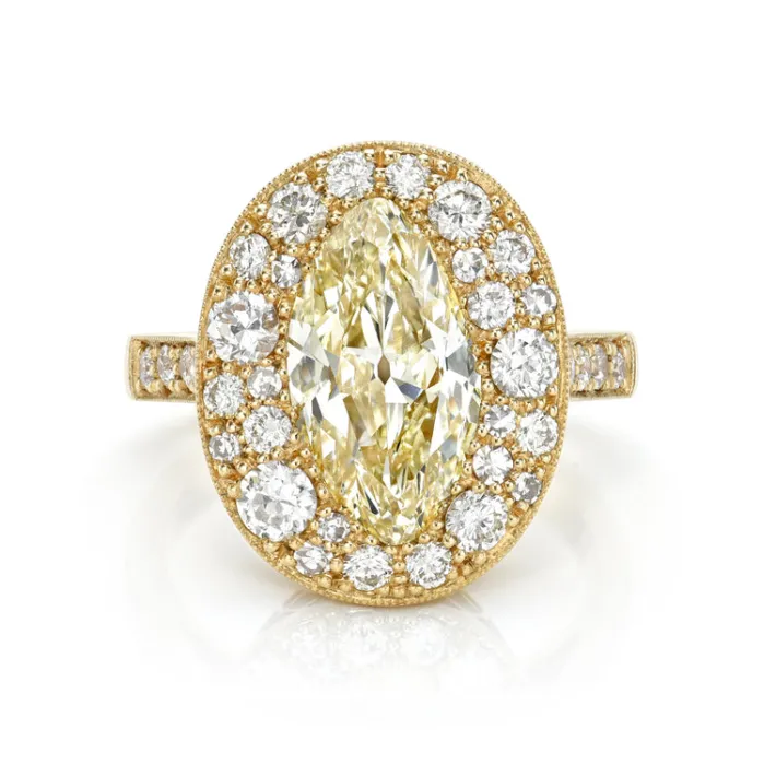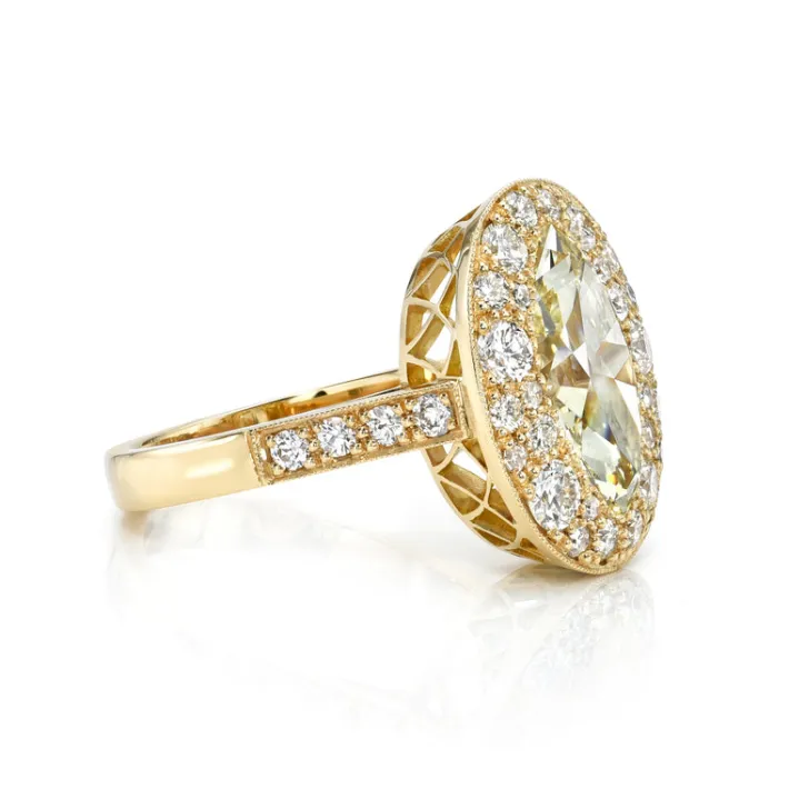 2.75ct N/SI1 GIA certified moval cut diamond amongst 0.96ctw mixed cut diamonds cobblestone set in a handcrafted 18K yellow gold mounting.