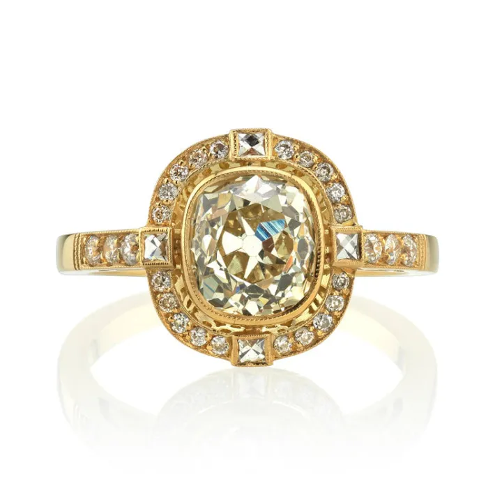 1.73ct K/SI1 EGL certified antique cushion cut diamond with 0.18ctw old European cut accent diamonds and 0.06ctw French cut accent diamonds set in a handcrafted 18K yellow gold mounting.