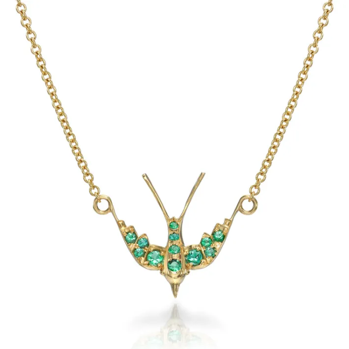 Approximately 0.35ctw round cut color gemstones set in a handcrafted 18K yellow gold swallow pendant necklace.Available …
