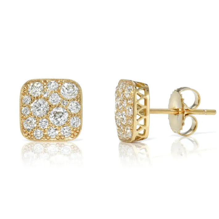 Approximately 1.25ctw various old cut and round brilliant cut diamonds set in handcrafted 18K yellow gold earrings. Available in an oxidized or polished finish.
