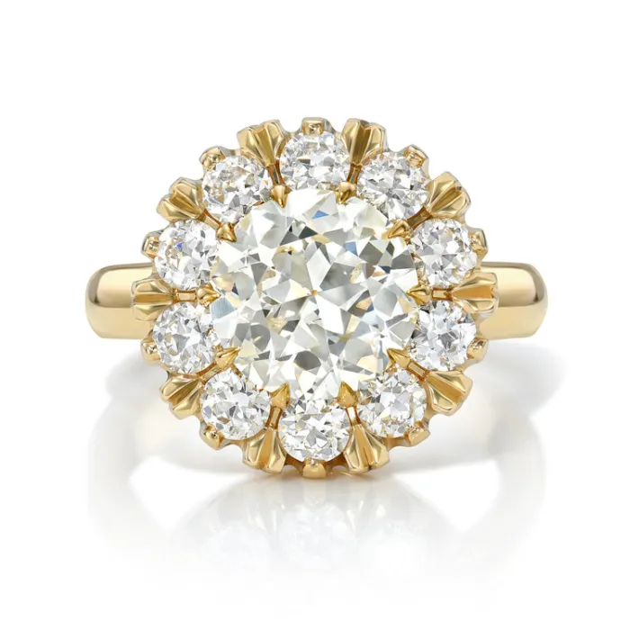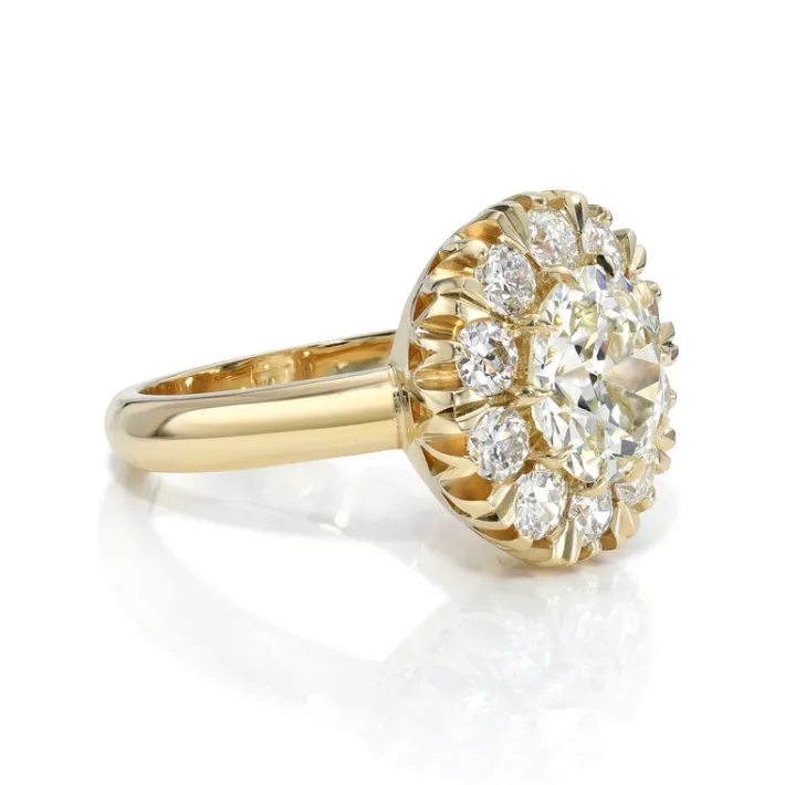 2.22ct L/VVS2 GIA certified old European cut diamond with 0.91ctw old European cut accent diamonds prong set in a handcrafted 18K yellow gold mounting.