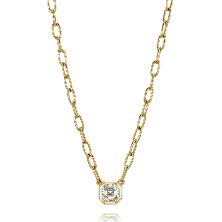 1.20ct L/VS2 GIA certified Asscher cut diamond bezel set on our handcrafted 18K yellow gold Bond chain.