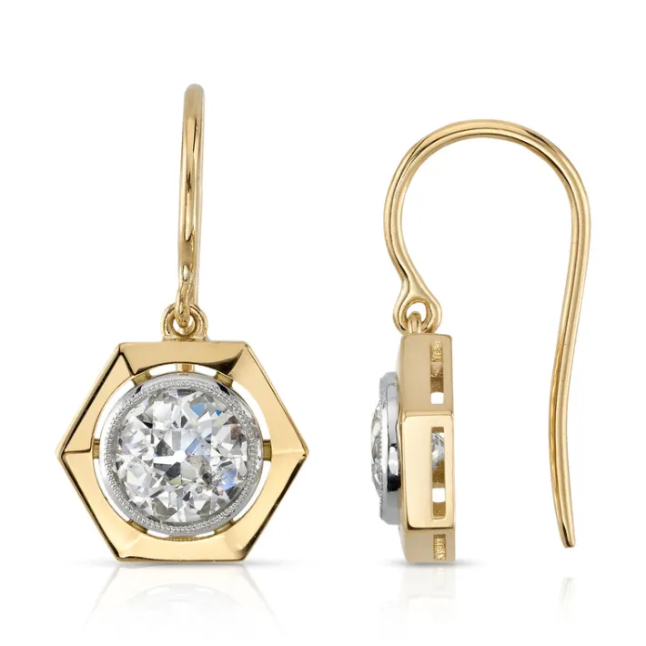 2.04ctw J-K/SI2-I1 GIA certified old European cut diamonds bezel set in handcrafted 18K yellow gold and platinum drop earrings.