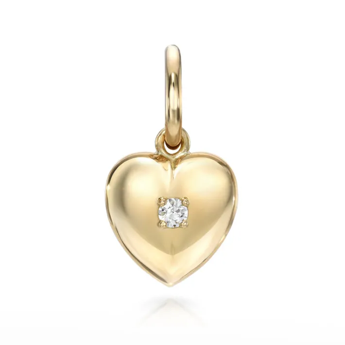 0.09ct I/VS2 old European cut diamond prong set in a handcrafted 18K yellow gold heart shaped pendant.