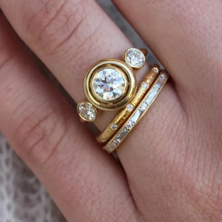 0.92ct J/VS1 EGL certified old European cut diamond with 0.50ctw old European cut accent diamonds set in a handcrafted 18K yellow gold mounting.