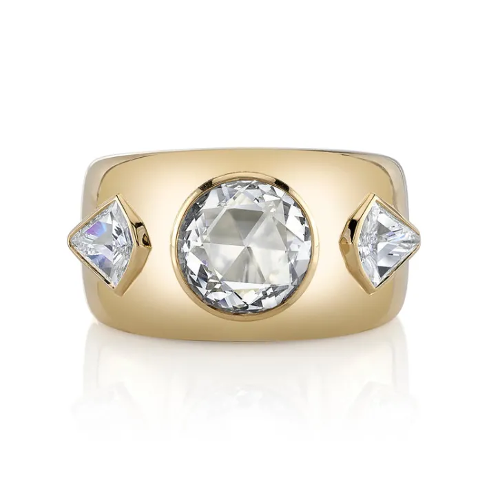 1.34ct M/VS1 GIA certified rose cut diamond with 0.70ctw kite cut accent diamonds set in a handcrafted 18K yellow gold mounting.