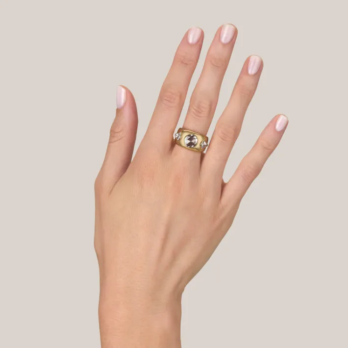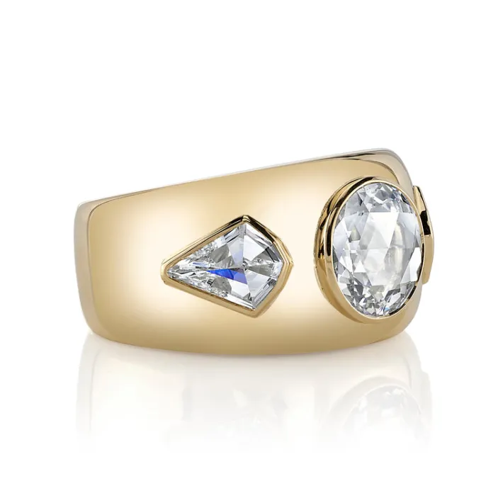 1.34ct M/VS1 GIA certified rose cut diamond with 0.70ctw kite cut accent diamonds set in a handcrafted 18K yellow gold m…