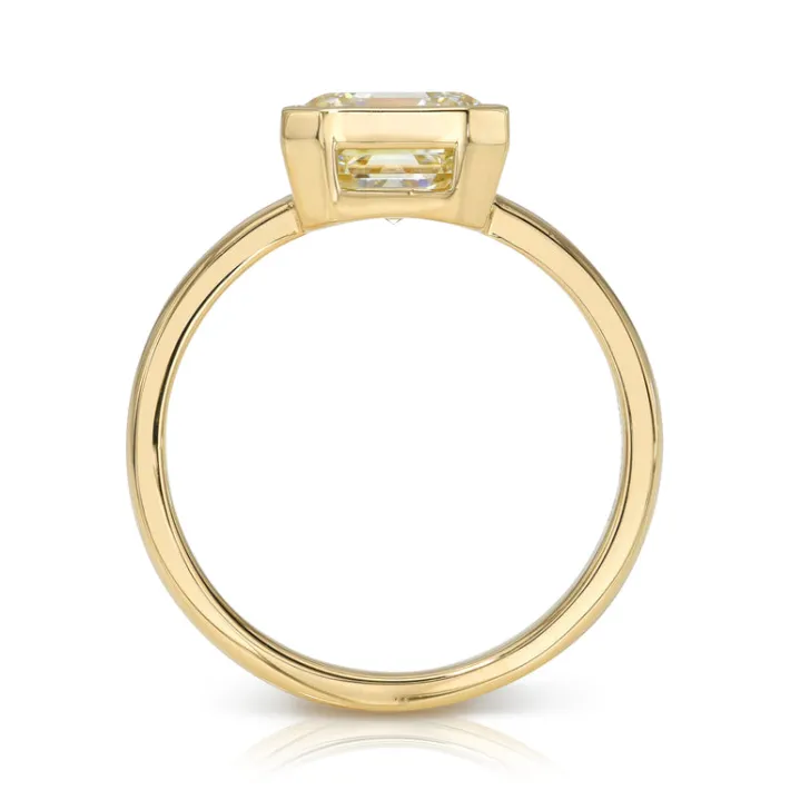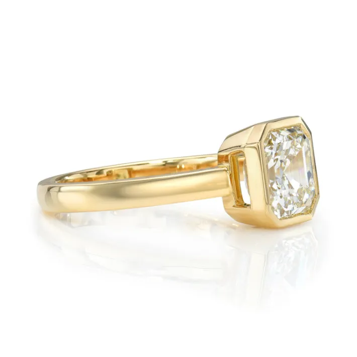 2.21ct M/VVS1 certified Asscher cut diamond bezel set in a handcrafted 18K yellow gold mounting.