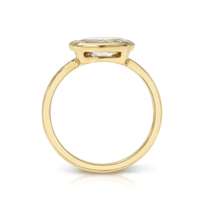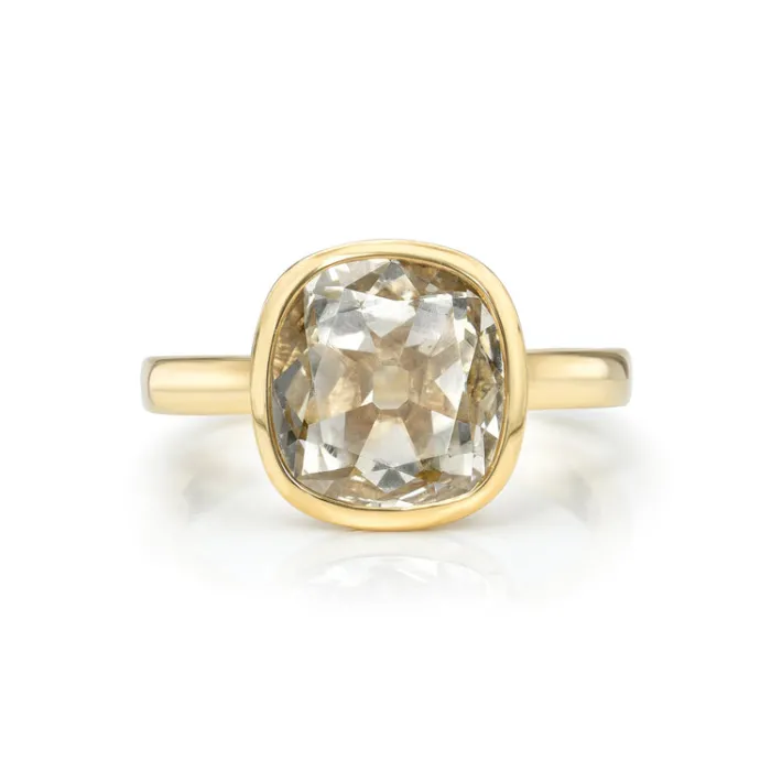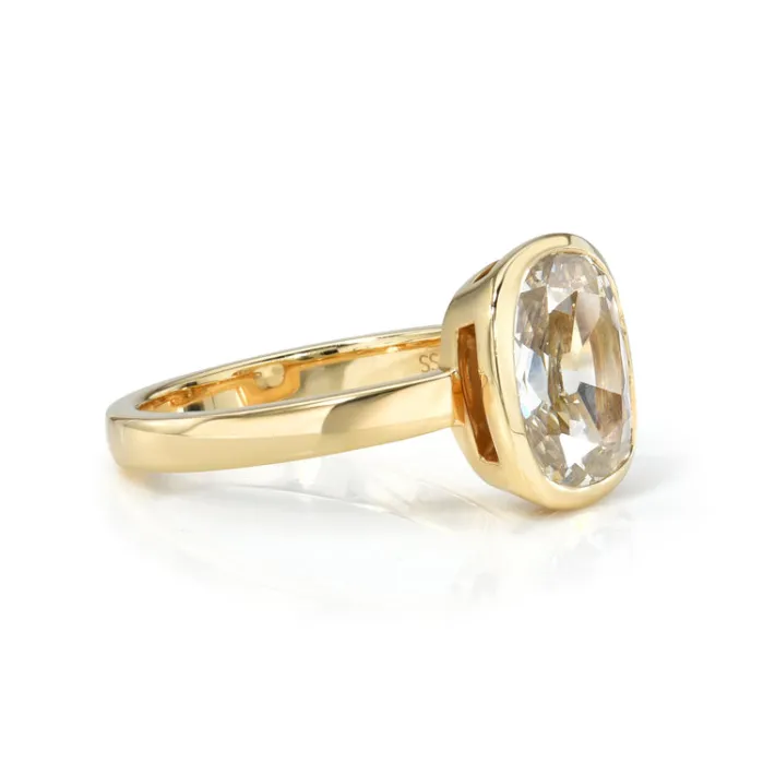 2.43ct O-P/SI1 GIA certified antique cushion cut diamond bezel set in a handcrafted 18K yellow gold mounting.