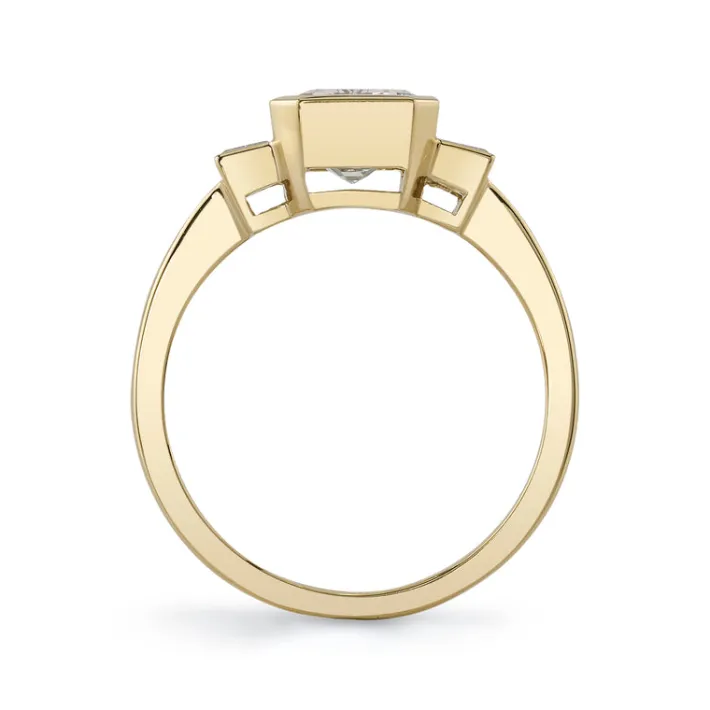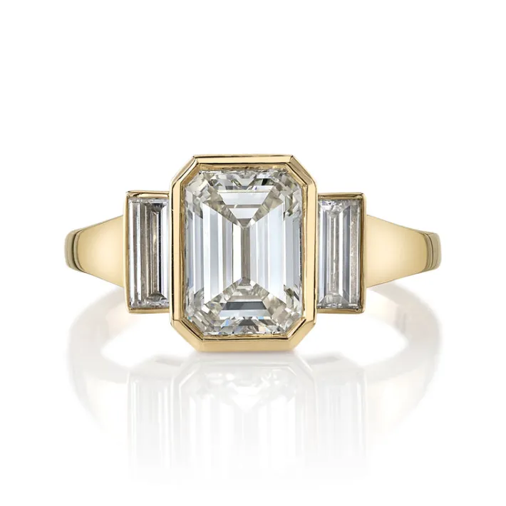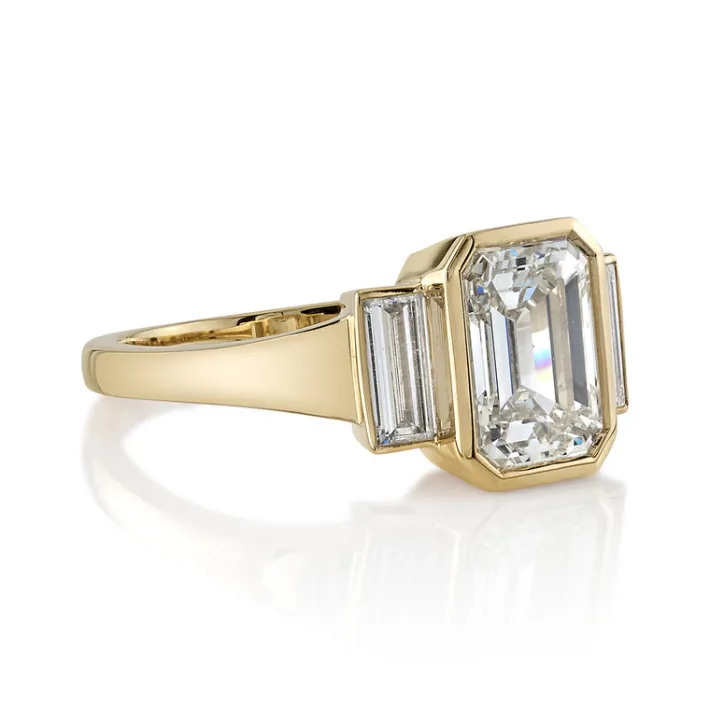 2.00ct N/VVS2 GIA certified emerald cut diamond with 0.35ctw baguette cut accent diamonds bezel set in a handcrafted 18K yellow gold mounting.
