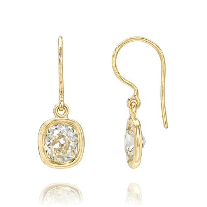 2.75ctw L/VS2-I1 GIA certified cushion cut diamonds set in handcrafted 18K yellow gold drop earrings.