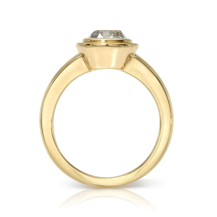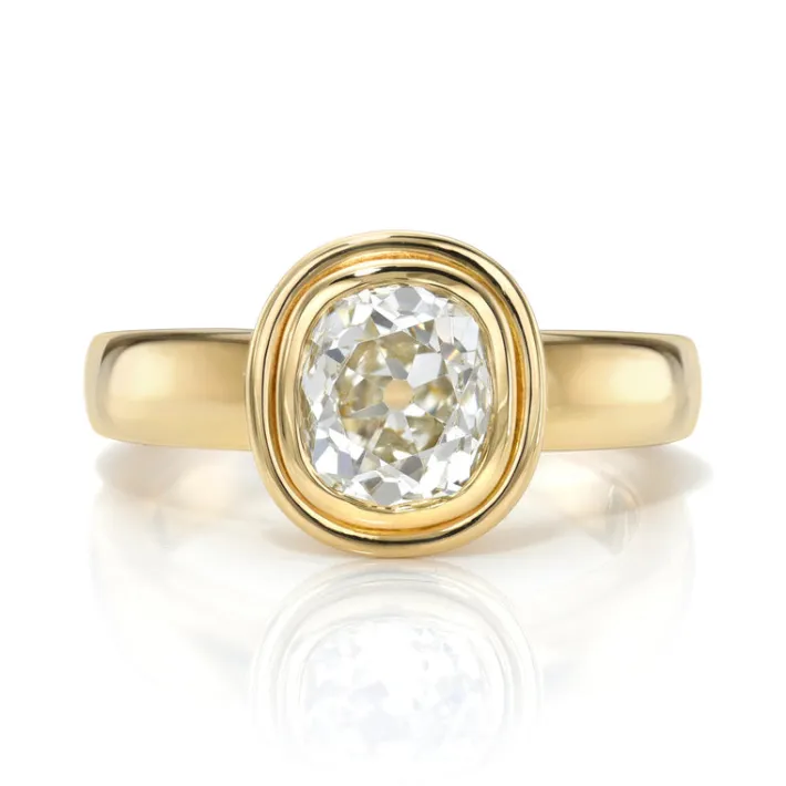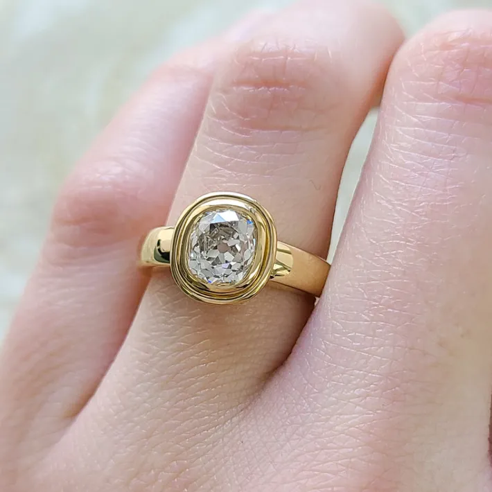 1.74ct L/SI1 GIA certified antique cushion cut diamond bezel set in a handcrafted 18K yellow gold mounting.