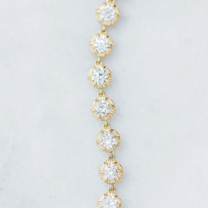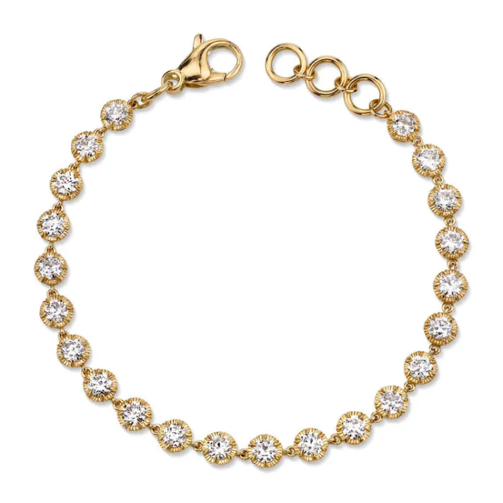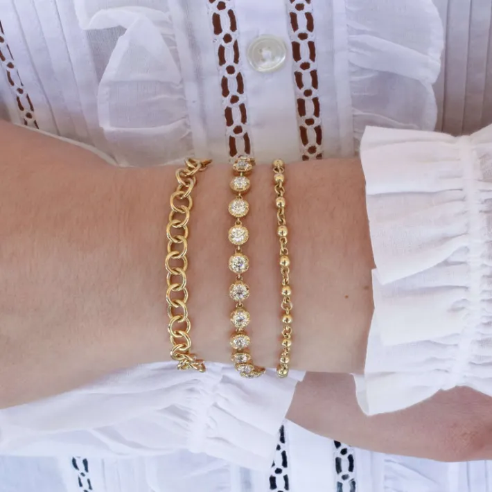 4.82ctw G-H/VS-SI old European cut diamonds prong set on a handcrafted 18K yellow gold tennis bracelet.