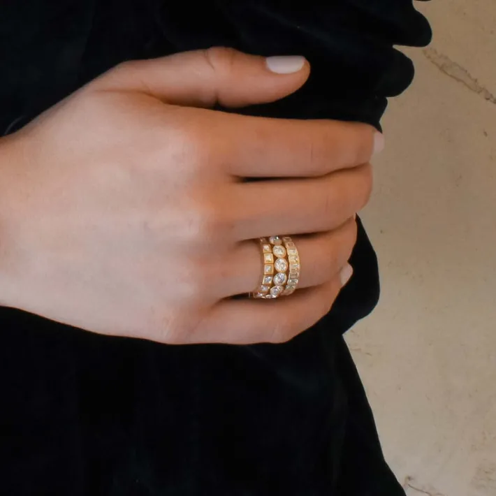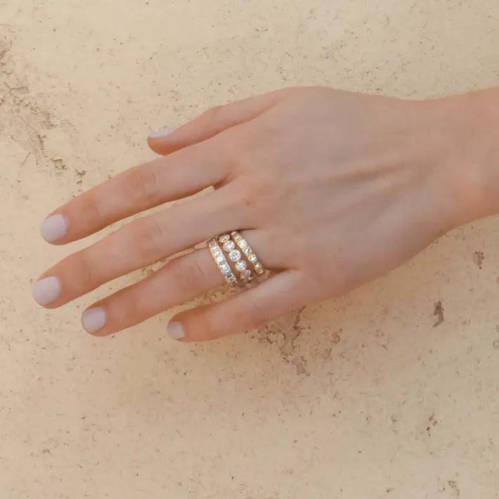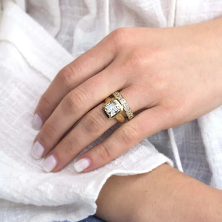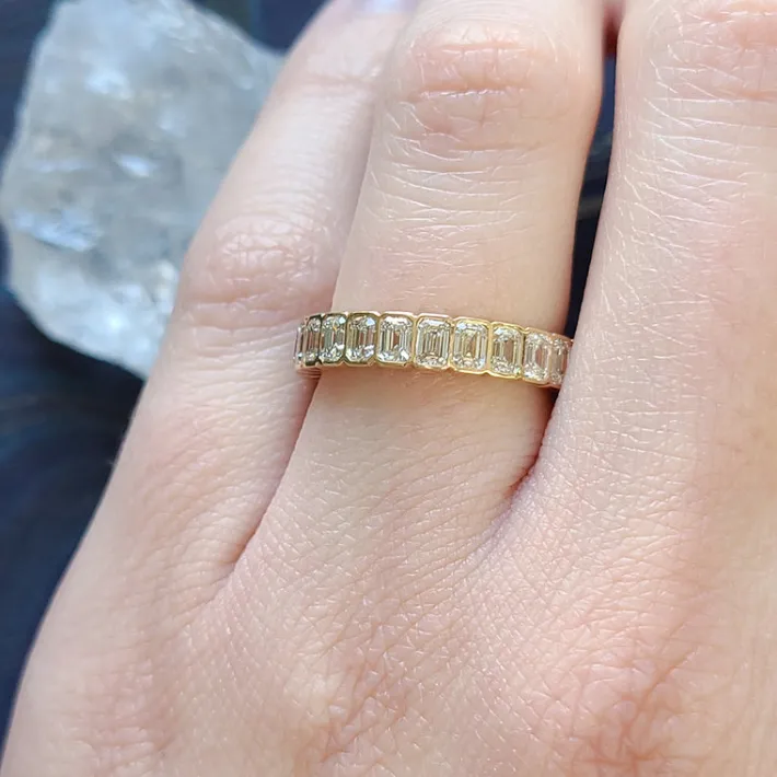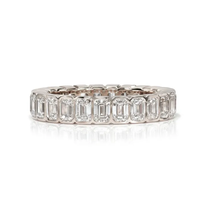 Approximately 2.50ctw H-I/VS emerald cut diamonds bezel set in a handcrafted eternity band.