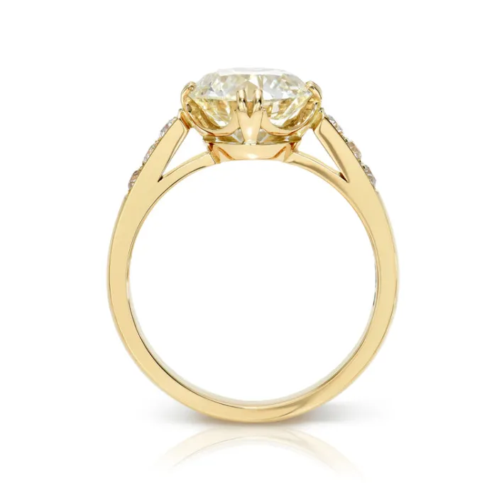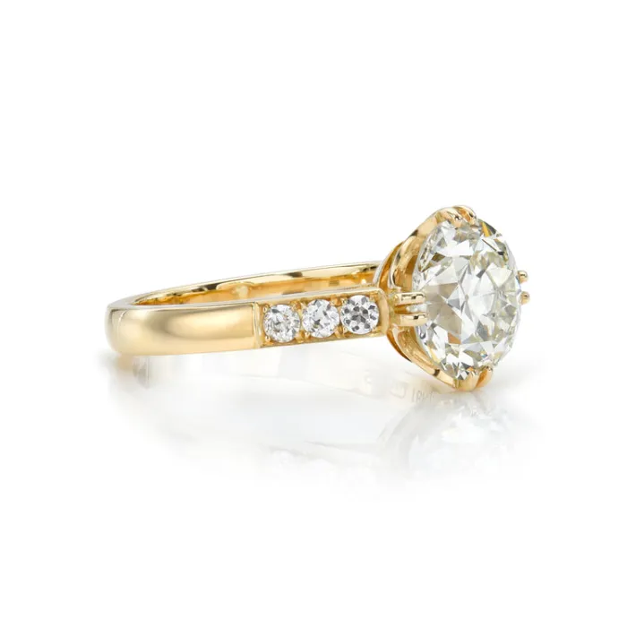 2.35ct K/VS2 GIA certified old European cut diamond with 0.18ctw old European cut accent diamonds prong set in a handcrafted 18K yellow gold mounting.