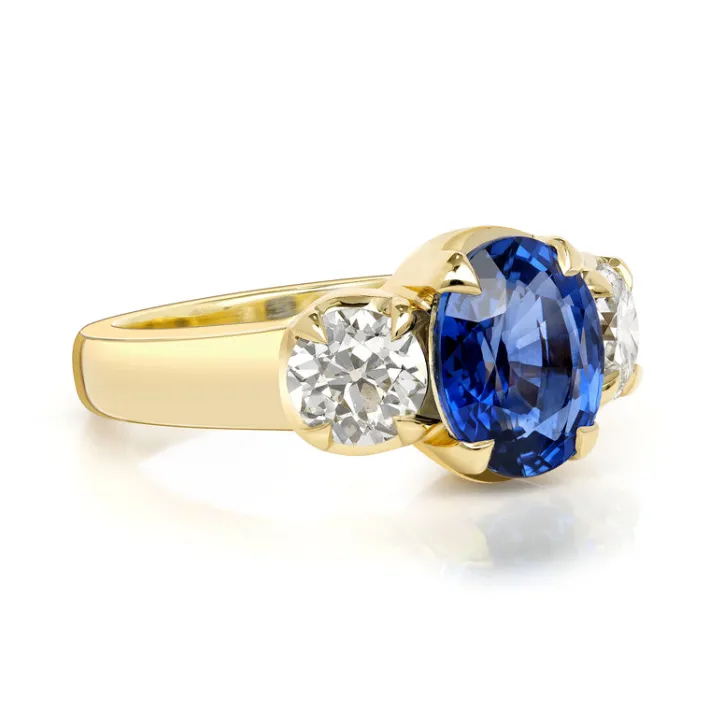 3.10ct GIA certified oval cut blue sapphire with 1.12ctw I-J/VS2-SI1 GIA certified old European cut accent diamonds prong set in a handcrafted 18K yellow gold mounting.