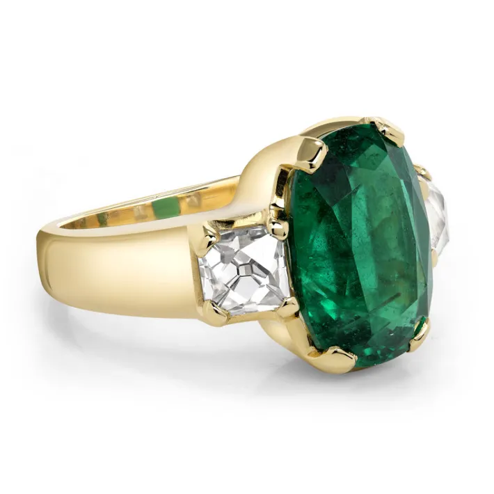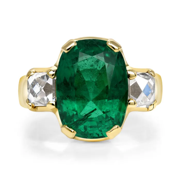 6.08ct GIA certified Zambian cushion cut green emerald flanked by 1.61ctw GIA certified E-F/VS1 French cut diamonds prong set in a handcrafted 18K yellow gold mounting.