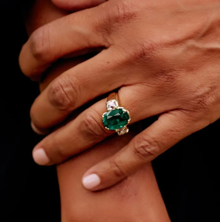 6.08ct GIA certified Zambian cushion cut green emerald flanked by 1.61ctw GIA certified E-F/VS1 French cut diamonds pron…