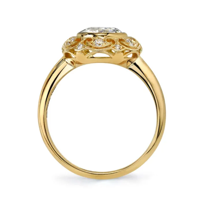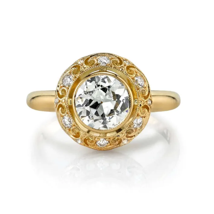 1.06ct K/SI1 GIA certified old European cut diamond with 0.11ctw old European cut accent diamonds set in a handcrafted 18K yellow gold mounting.