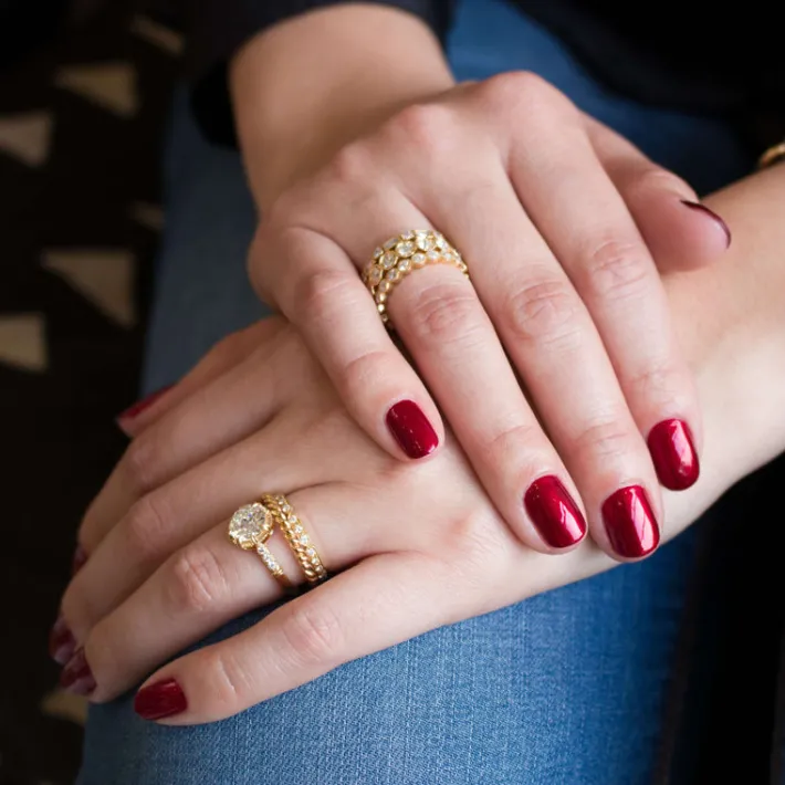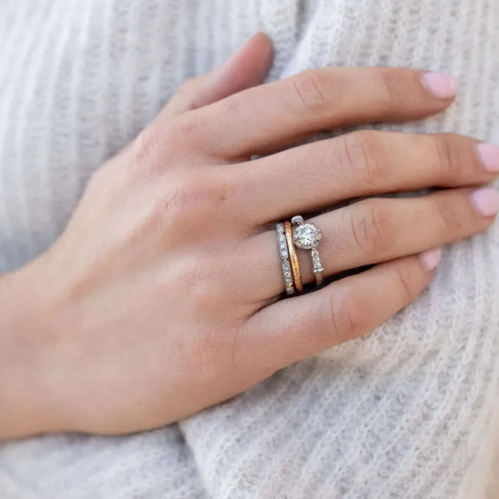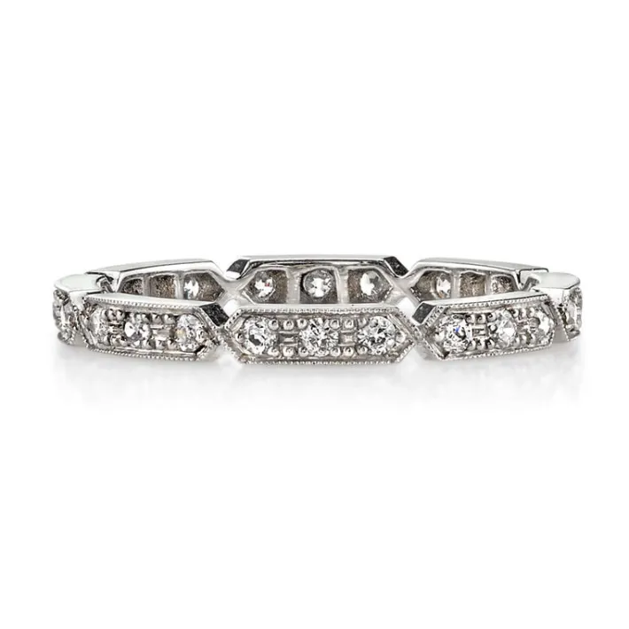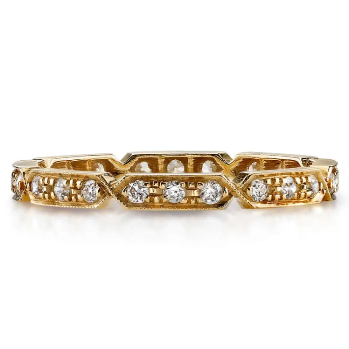 Approximately 0.30ctw G-H/VS old European cut diamonds set in a handcrafted, geometric sectional eternity band.