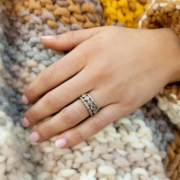 Approximately 0.30ctw G-H/VS old European cut diamonds set in a handcrafted, geometric sectional eternity band. Approxim…