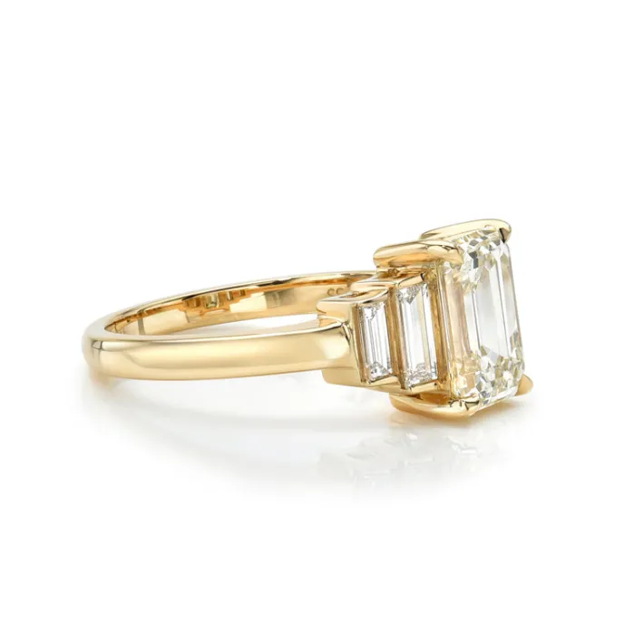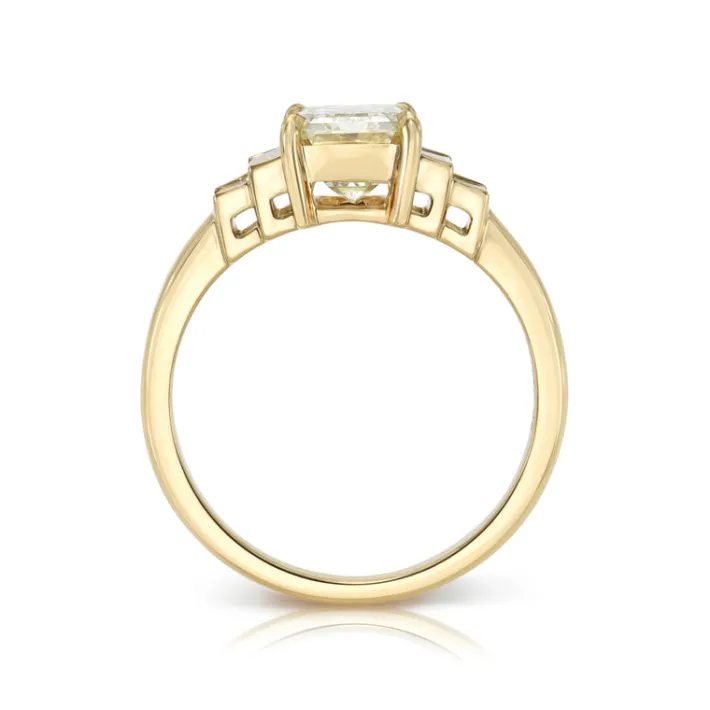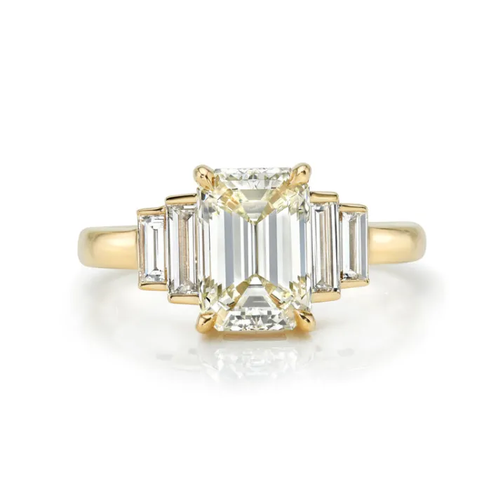 2.01ct M/VVS2 GIA certified emerald cut diamond with 0.47ctw baguette cut accent diamonds prong set in a handcrafted 18K yellow gold mounting.