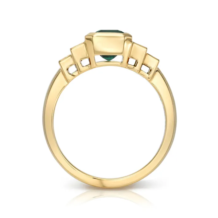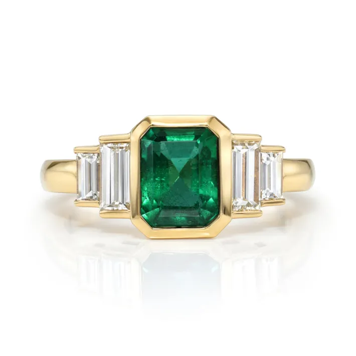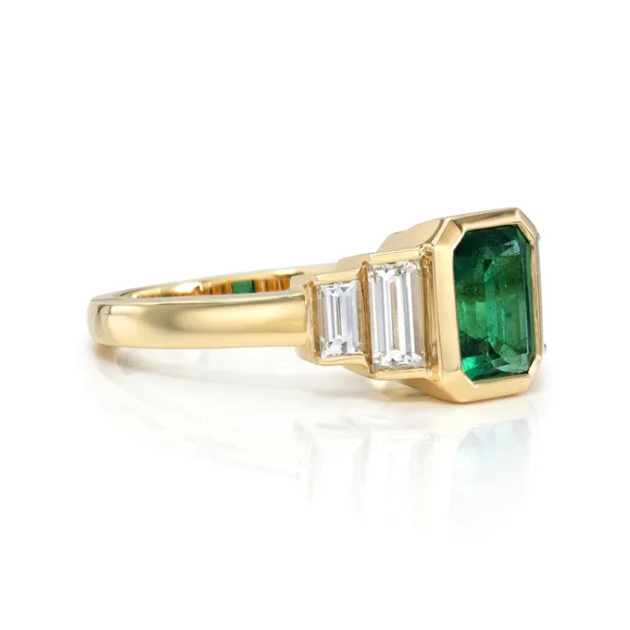 1.46ct GIA certified Zambian emerald cut green emerald with 0.66ctw baguette cut accent diamonds bezel set in a handcrafted 18K yellow gold mounting.