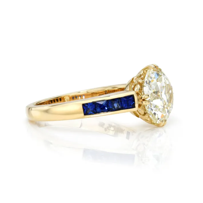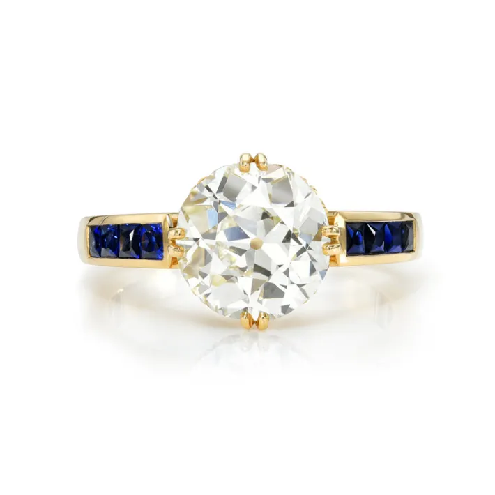 2.58ct L/VS1 GIA certified old European cut diamond prong set with 0.60ctw French cut blue sapphire accent stones.