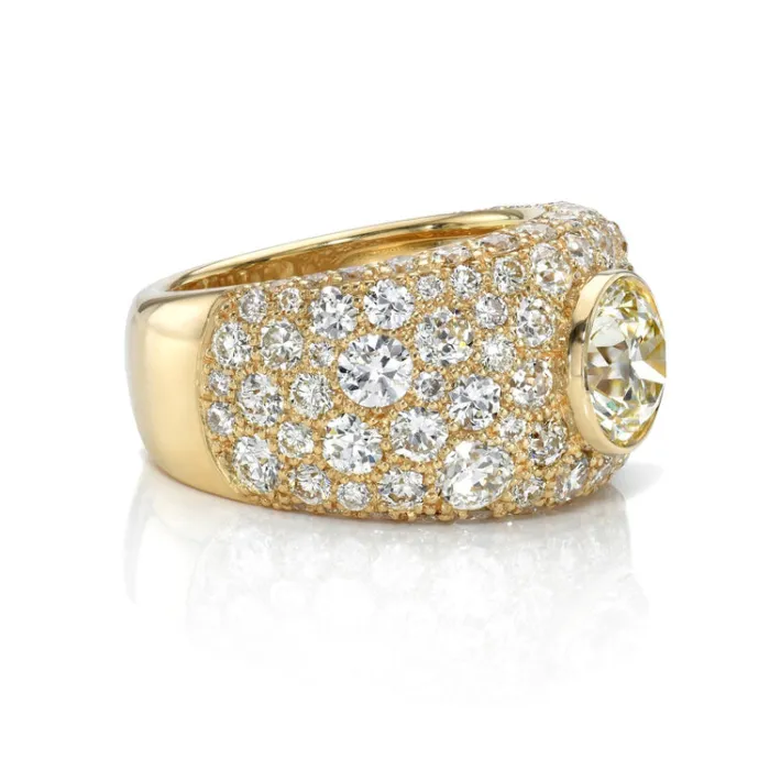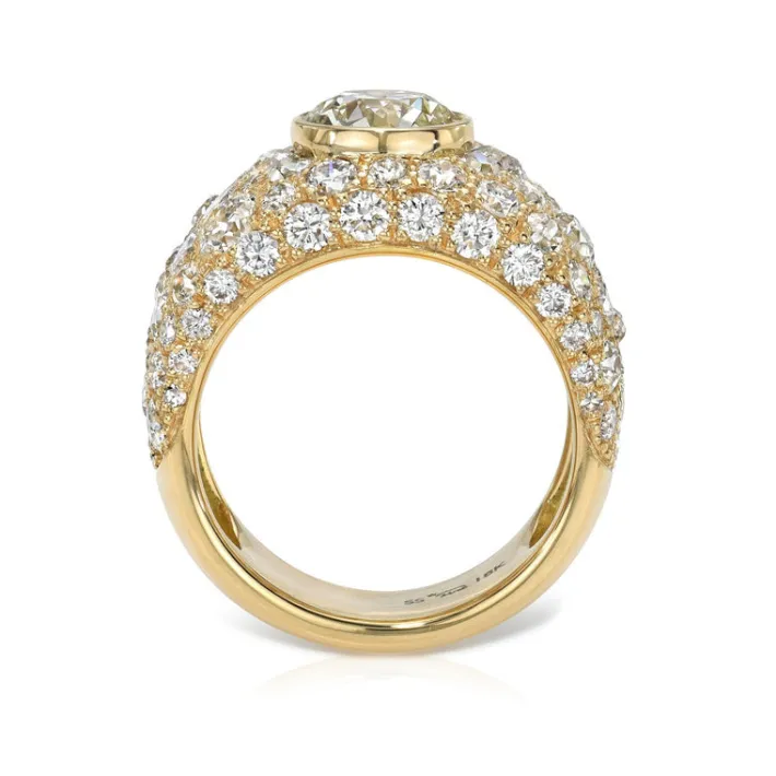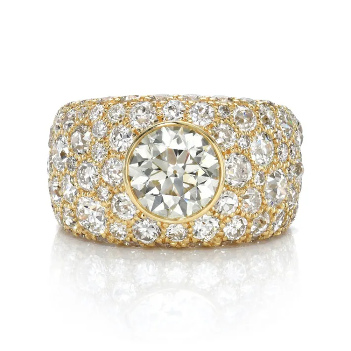 1.71ct M/VS1 GIA certified old European cut diamond with 4.63ctw varying old cut and round brilliant cut diamonds set in a handcrafted 18K yellow gold domed band.