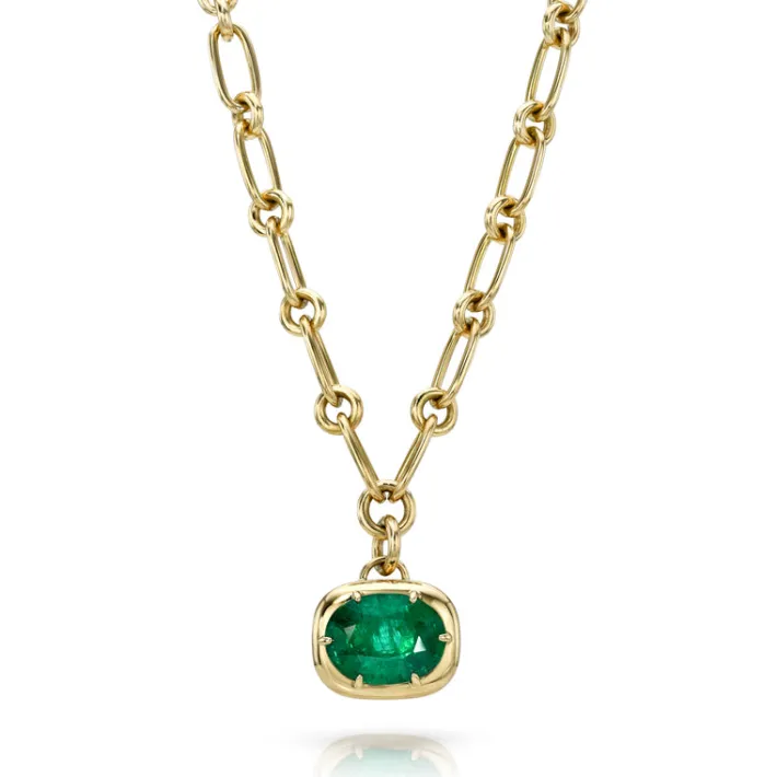 5.53ct GIA certified oval cut green emerald prong set on our handcrafted 18K yellow gold Lo necklace.