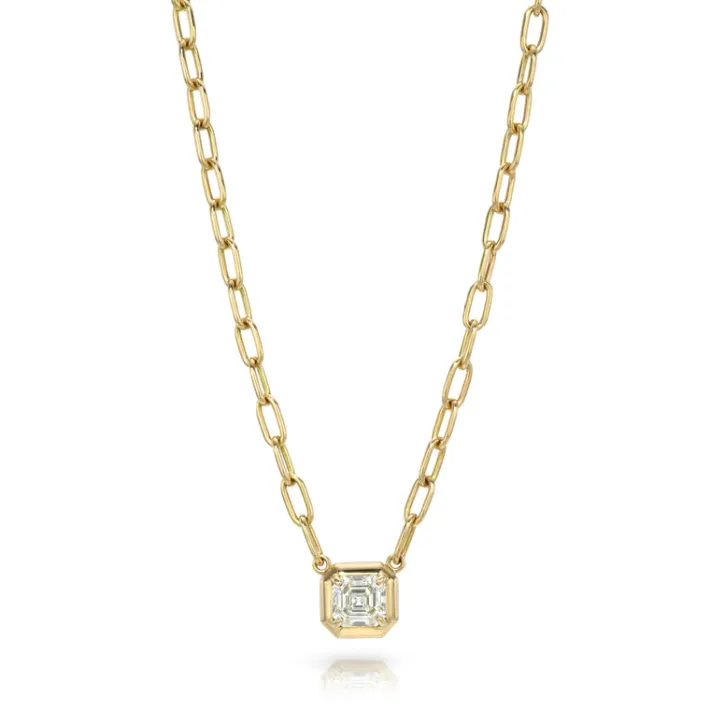 1.08ct O-P/VS2 GIA certified Asscher cut diamond prong set on our handcrafted 18K yellow gold Bond chain.Necklace measur…