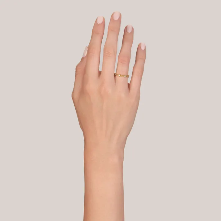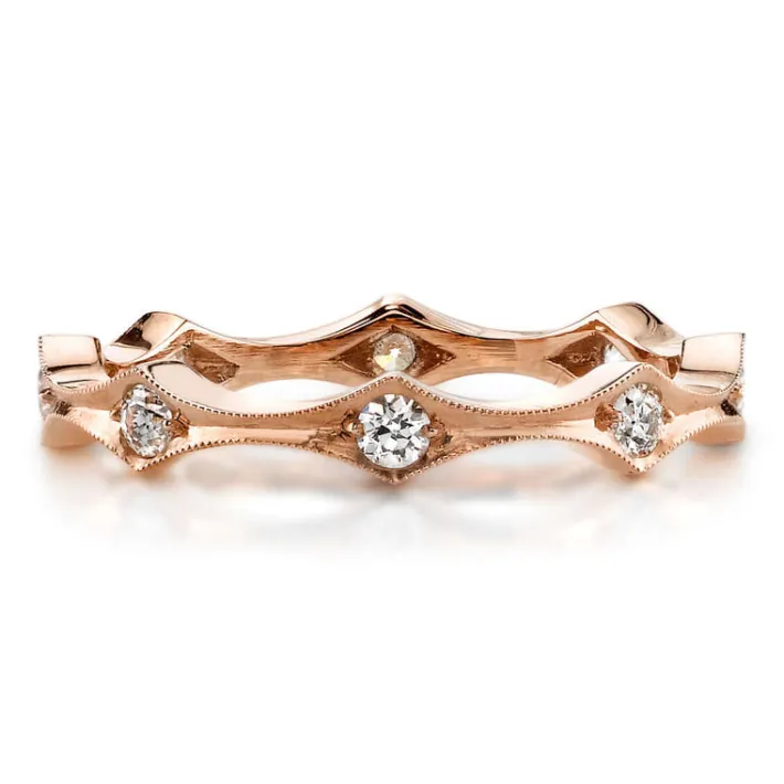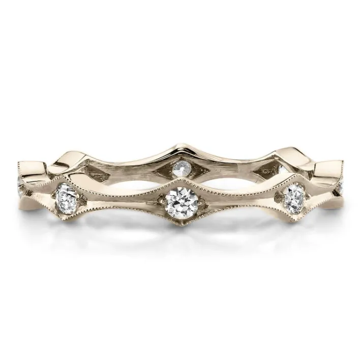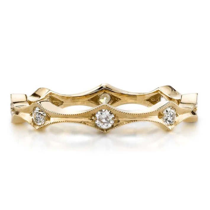 Approximately 0.25ctw old European cut diamonds prong set in a handcrafted eternity band.
