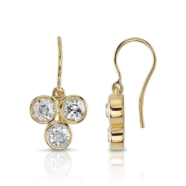 1.54ctw J-K/VS-SI old European and antique old mine cut diamonds mounted in handcrafted 18K yellow gold drop earrings.