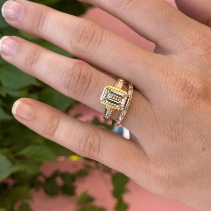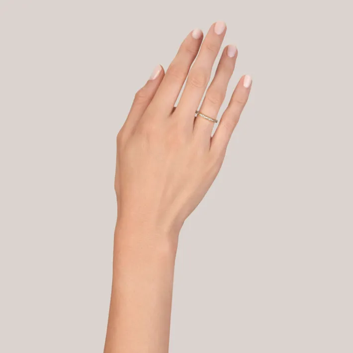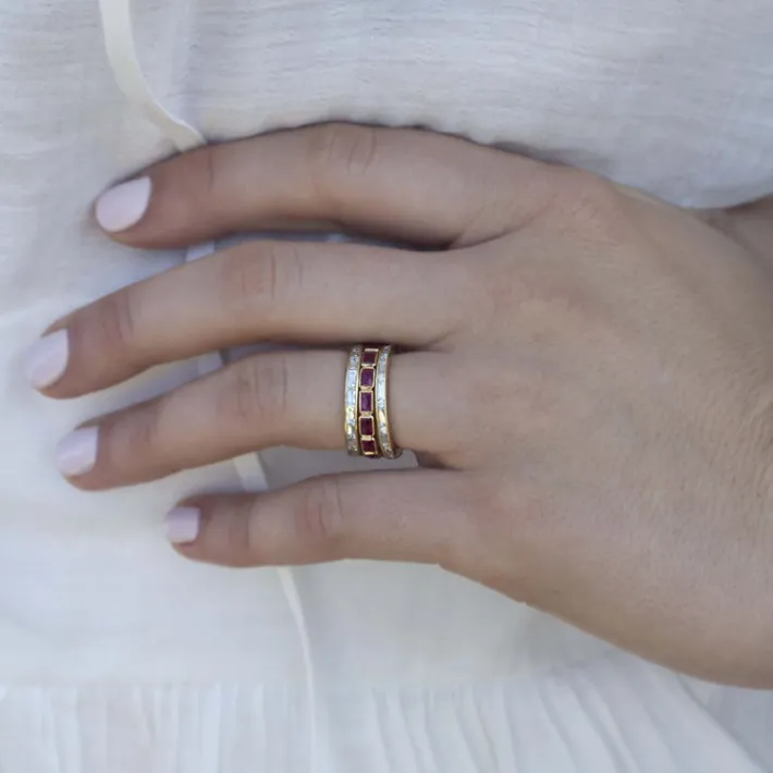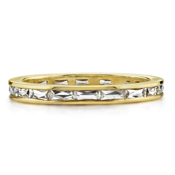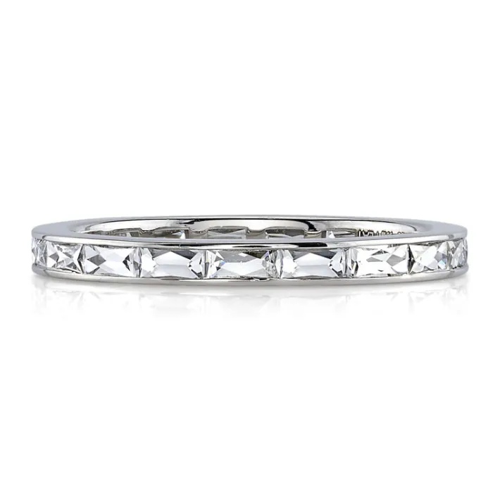 Approximately 0.90ctw G-H/VS French cut diamonds channel set in a handcrafted eternity band.