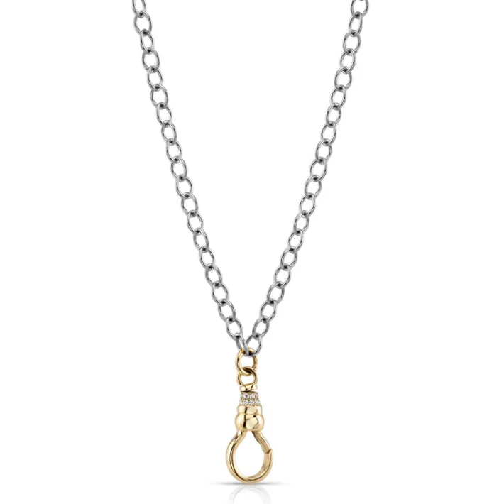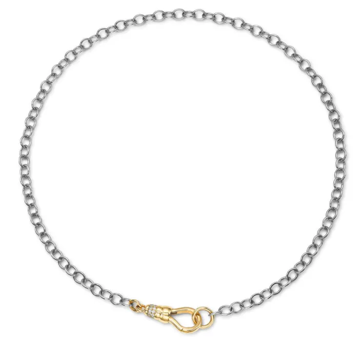 Handcrafted platinum link chain featuring a 18K yellow gold fob clasp with approximately 0.20ctw G-H/VS pavé set old European cut accent diamonds.