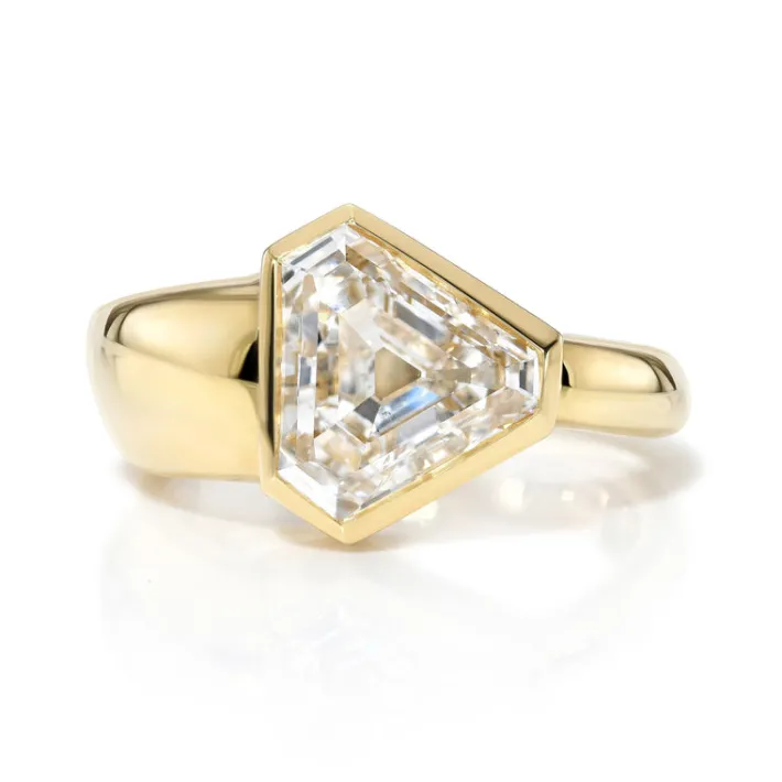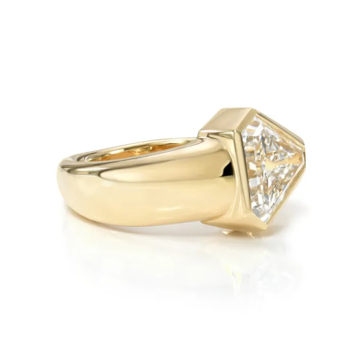 2.50ct F/SI1 GIA certified vintage Trapezoid cut diamond bezel set in a handcrafted 18K yellow gold mounting with a tapered shank.