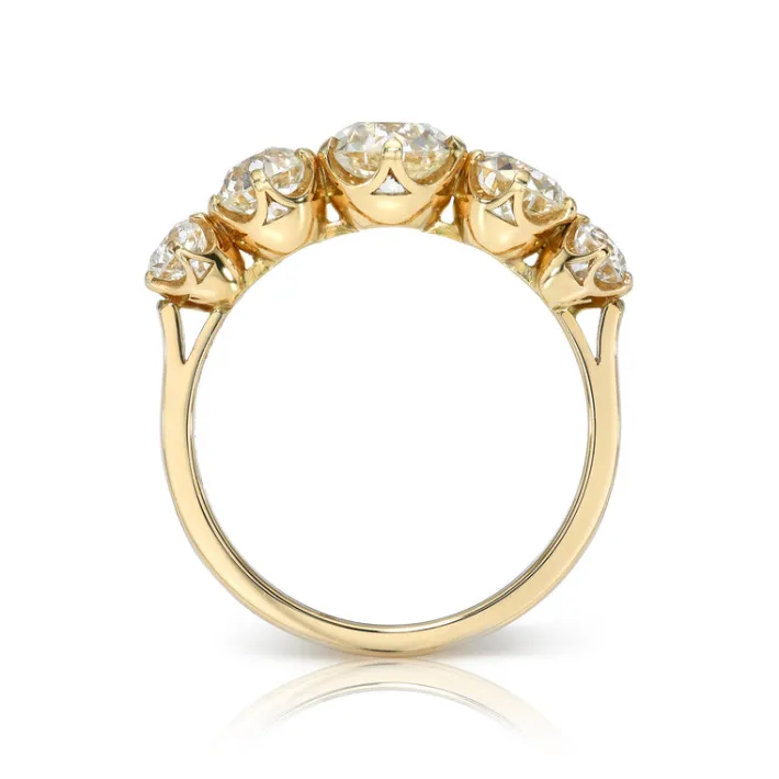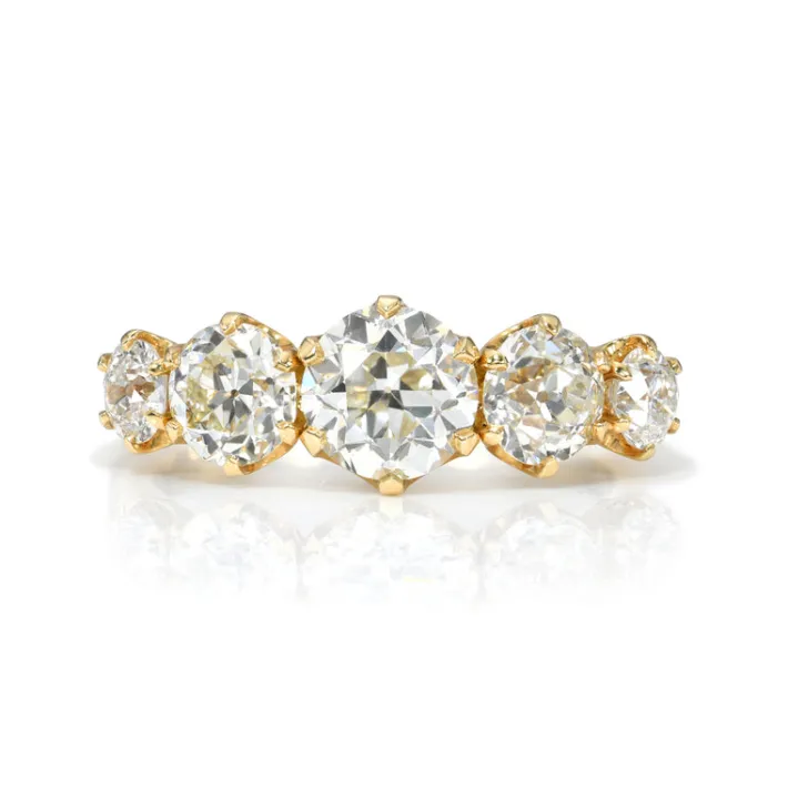 1.89ctw J-K/VS1-VS2-SI1 GIA certified old European cut diamonds with 0.41ctw old European cut accent diamonds prong set in a handcrafted 18K yellow gold mounting.