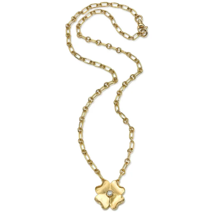 0.11ct G-H/VS old European cut diamond bezel set in a handcrafted 18K yellow gold clover shaped pendant mounted on our handcrafted 18K yellow gold Mini Lo necklace.