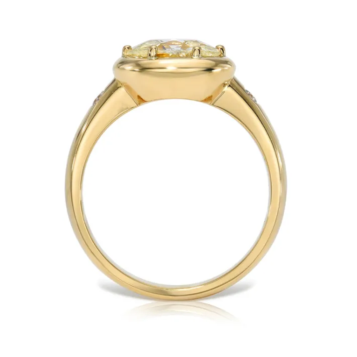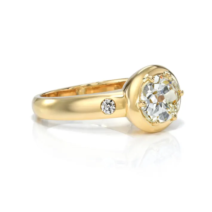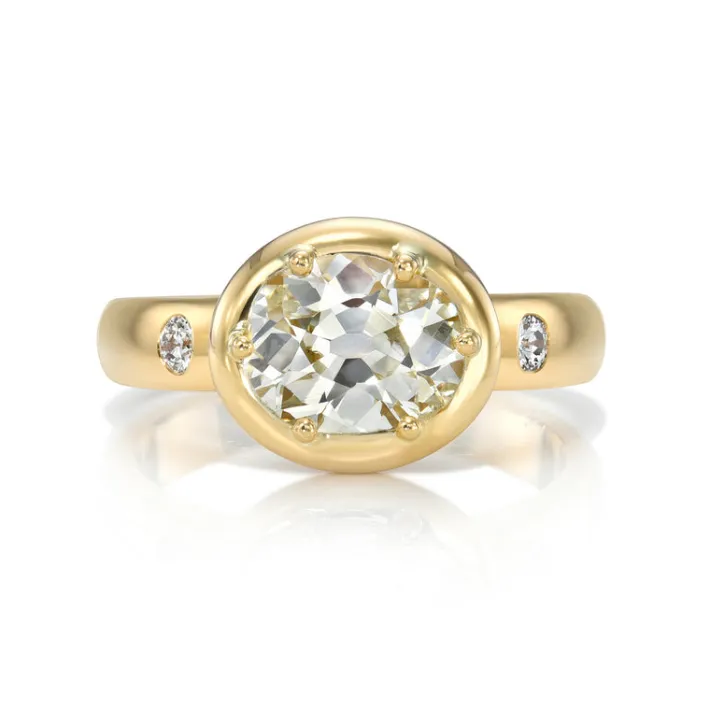 1.55ct L/VS2 GIA certified oval cut diamond with 0.07ctw old European cut accent diamonds prong set in a handcrafted 18K yellow gold mounting.