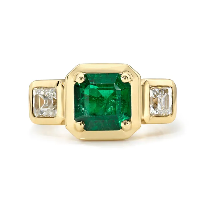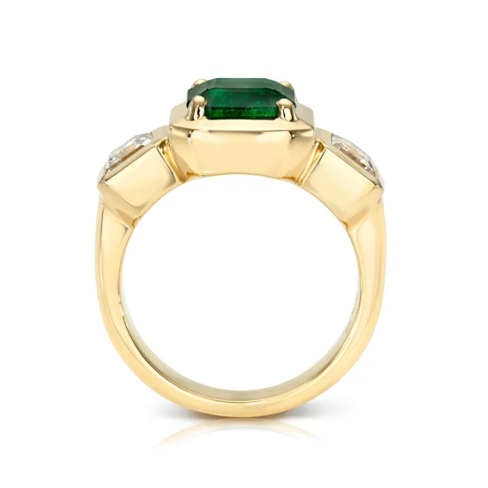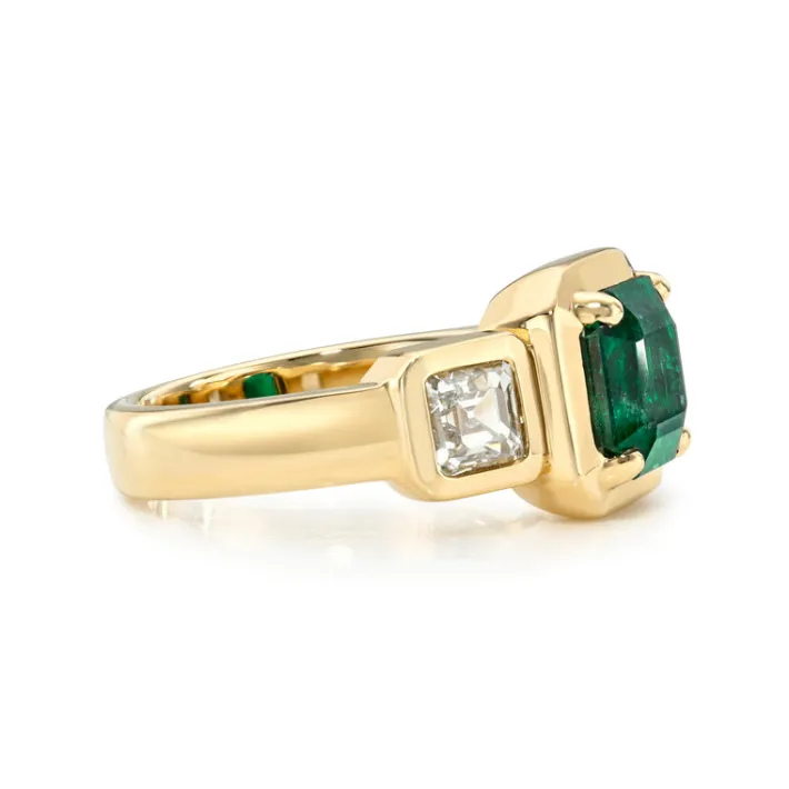 1.81ct GIA certified octagonal step cut green emerald with 0.97ctw Asscher cut accent diamonds set in a handcrafted 18K yellow gold mounting.