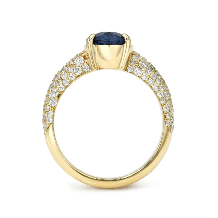 3.07ct GIA certified Sri Lankan oval cut blue sapphire with 0.84ctw old European cut accent diamonds prong set in a handcrafted 18K yellow gold mounting.