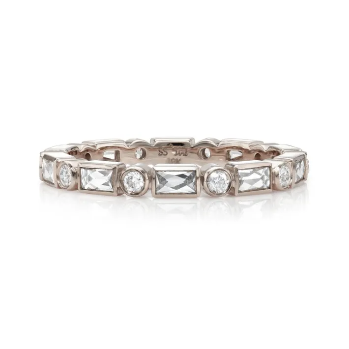 Approximately 1.00ctw G-H/VS old European and French cut diamonds bezel set in a handcrafted eternity band.