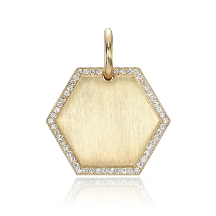 Handcrafted 25mm 18K yellow gold engravable hexagon disc with approximately 0.35ctw G-H/VS old European cut pavé set diamonds.