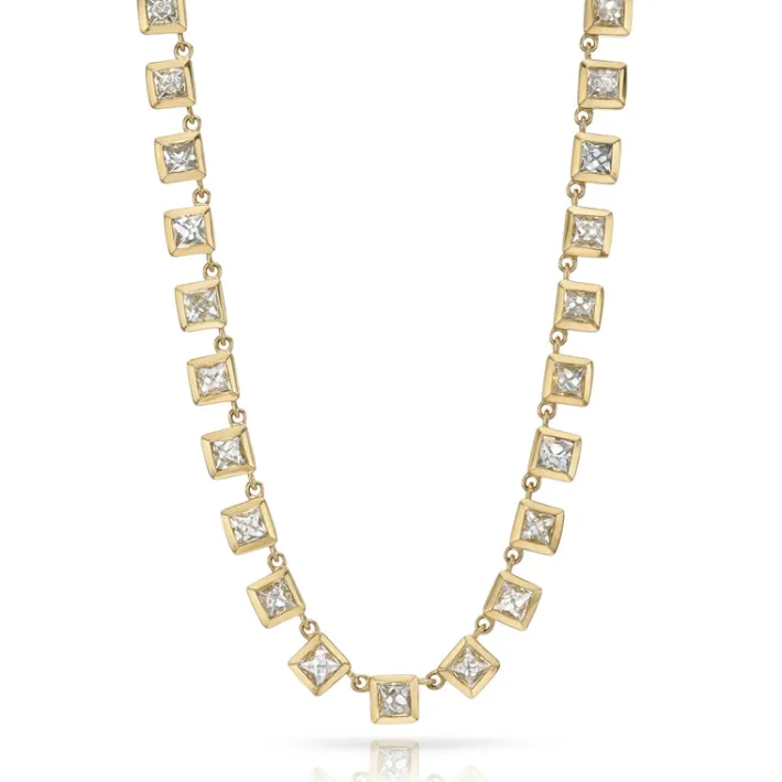 15.34ctw H-I/VS-SI square French cut diamonds bezel set in a handcrafted 18K yellow gold necklace.