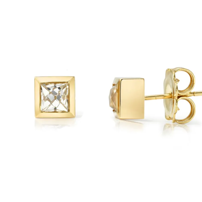 1.67ctw E-G/VS2-SI2 GIA certified French cut diamonds bezel set in handcrafted 18K yellow gold stud earrings.