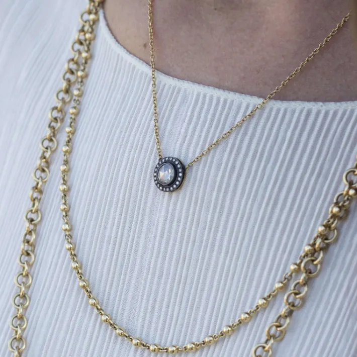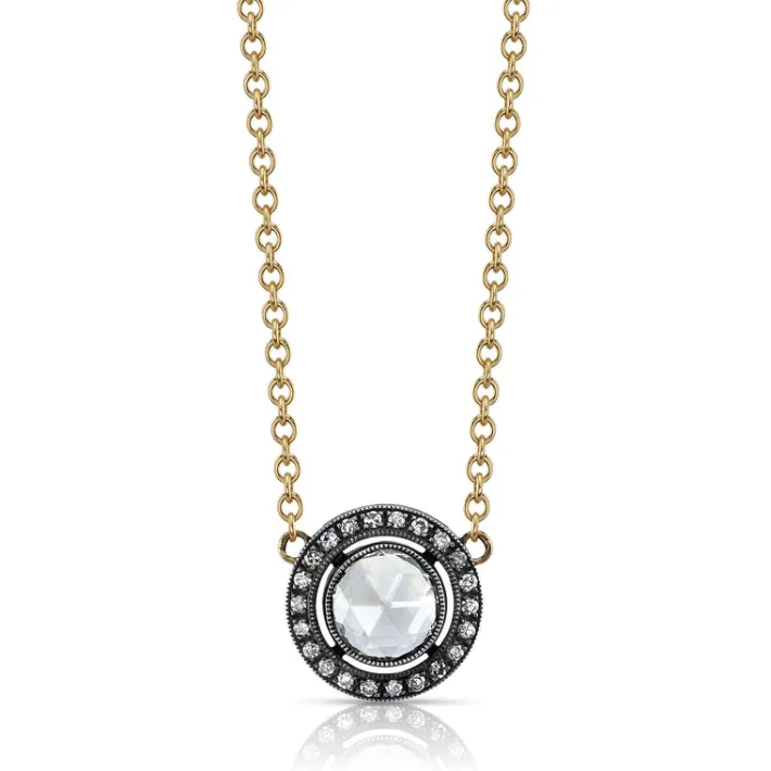 0.78ct F/SI2 rose cut diamond with 0.13ctw single cut accent diamonds set in a handcrafted 18K yellow gold and oxidized sterling silver pendant necklace.
