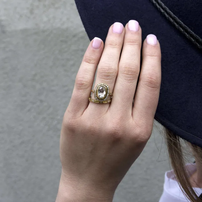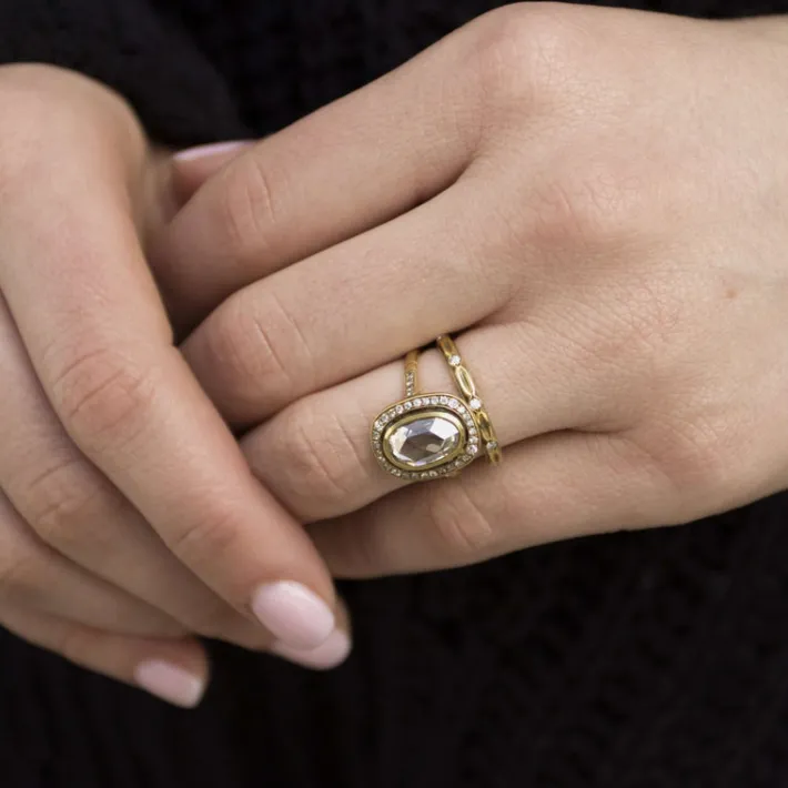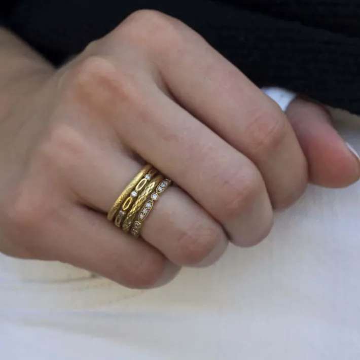 Approximately 0.20ctw G-H/VS old European cut diamonds set in a handcrafted, oxidized 18K gold eternity band.
