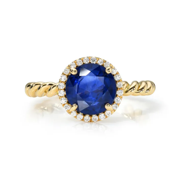 2.91ct round cut blue sapphire with 0.11ctw old European cut accent diamonds set in a handcrafted 18K yellow gold mounting.