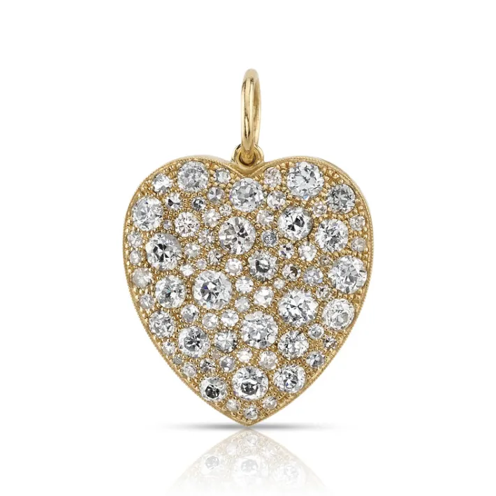 4.54ctw old cut and round brilliant cut diamonds set in a handcrafted 18K yellow gold heart shaped pendant.