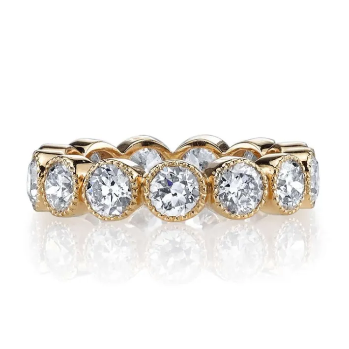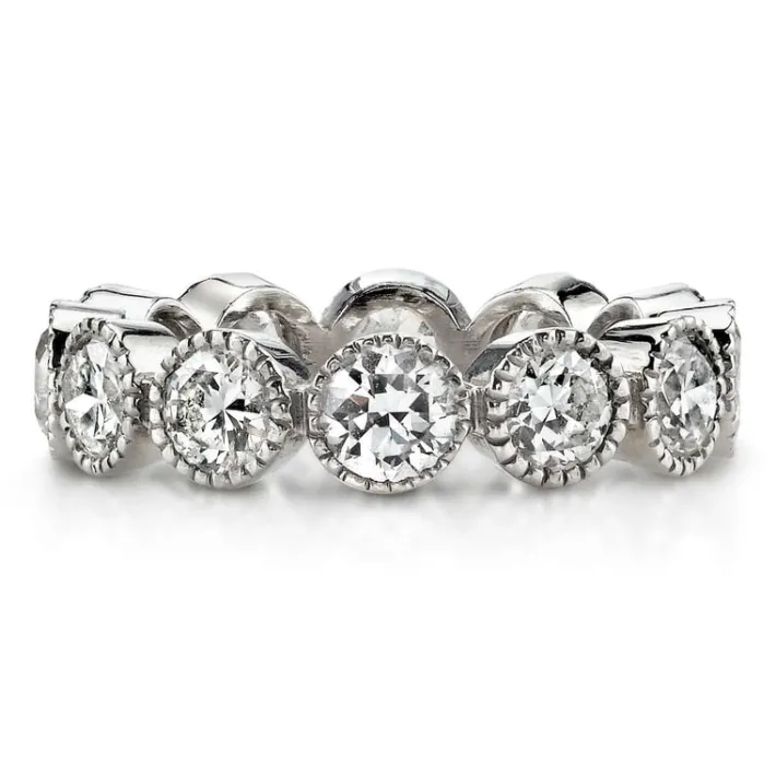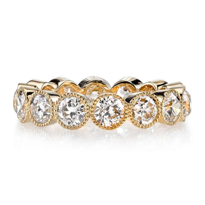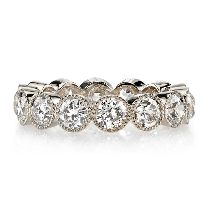 Approximately 3.00-3.30ctw old European cut diamonds bezel set in a handcrafted eternity band. Approximate band width 4….